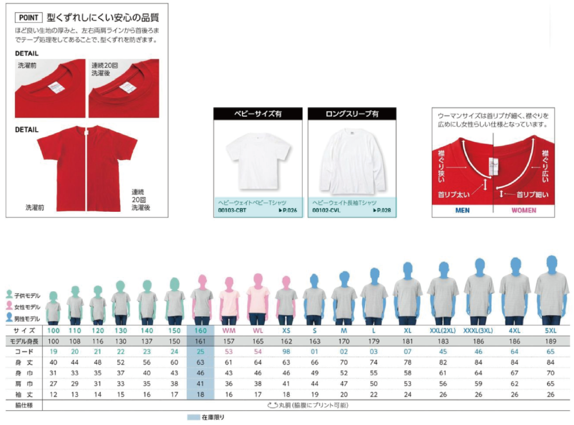 ウーマンサイズは首リブが細く、襟ぐりを広めにし女性らしい仕様となっています。